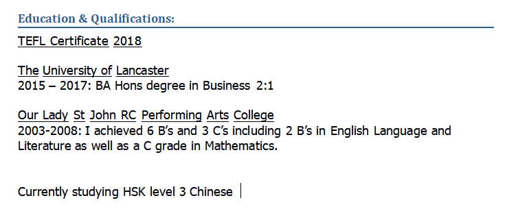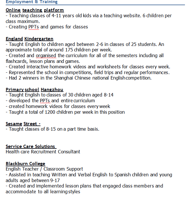 工作經(jīng)歷: 就業(yè)與培訓(xùn) 在線教學(xué)平臺(tái) -通過(guò)教學(xué)網(wǎng)站為4-11歲的孩子開(kāi)設(shè)教學(xué)班。每班最多6個(gè)孩子 英格蘭幼兒園 -在25名學(xué)生的課堂上為2-6歲之間的孩子講英語(yǔ)。大約每周大約有175個(gè)孩子。 杭州小學(xué) -向30至8歲的30歲兒童授課英語(yǔ) 芝麻街 - -兼讀制8-15班 教育: 蘭開(kāi)斯特大學(xué) 2015年– 2017年:商業(yè)學(xué)士學(xué)位2:1 tefl證書(shū) 圣母圣約翰RC表演藝術(shù)學(xué)院 2003-2008年:我獲得了6個(gè)B和3個(gè)C的成績(jī),其中包括2個(gè)B和2個(gè)英語(yǔ)語(yǔ)言文學(xué)專業(yè)的成績(jī),以及一個(gè)C的數(shù)學(xué)成績(jī) 漢語(yǔ)三級(jí)。 |