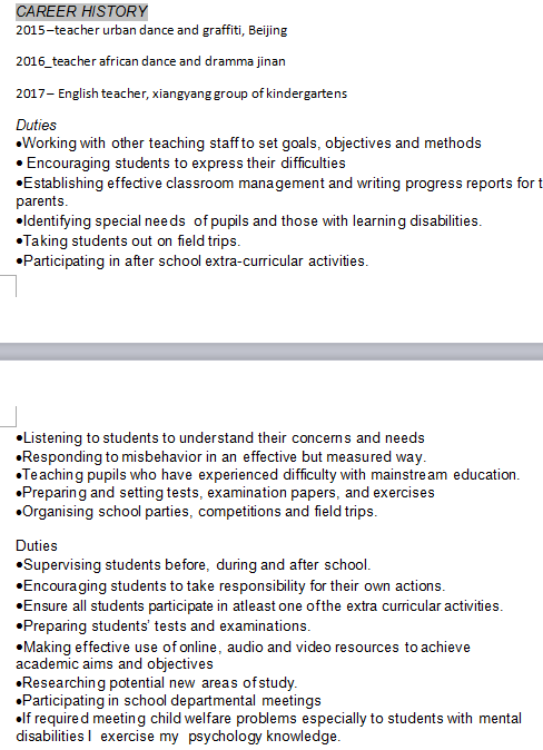 英語專業(yè)領域的學習課程: 學習過很多關于英語及英語教學方面的課程 : 2015 -教師 北京 (涂鴉與舞蹈學校) 2016_教師 非洲舞蹈和戲劇 濟南 2017 -襄陽幼兒園 英語教師 |