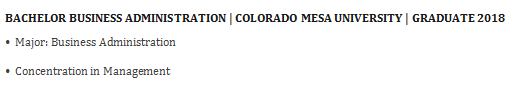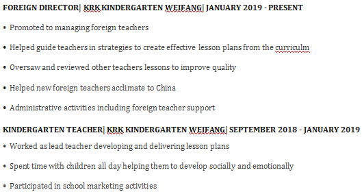 教育 工商管理學(xué)士| 科羅拉多梅薩大學(xué)| 2018屆畢業(yè)生 ?專業(yè):工商管理 ?集中管理 經(jīng)驗(yàn) 外國導(dǎo)演| 濰坊克爾克幼兒園| 2019年1月至今 ?促進(jìn)外籍教師的管理 ?幫助指導(dǎo)教師制定策略,從課程中制定有效的課程計(jì)劃 ?監(jiān)督并復(fù)習(xí)其他教師課程以提高質(zhì)量 ?幫助新來的外國老師適應(yīng)中國 ?行政活動,包括外國老師的支持 幼兒園老師| 濰坊克爾克幼兒園| 2018年9月-2019年1月 ?擔(dān)任首席老師,制定和交付課程計(jì)劃 ?全天陪伴孩子,幫助他們在社交和情感上發(fā)展 ?參加學(xué)校營銷活動 |