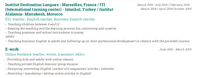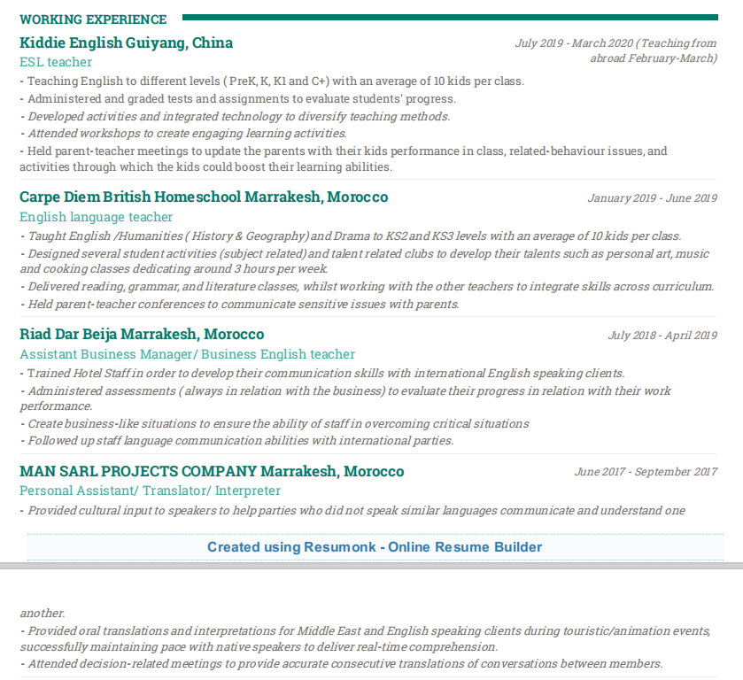 英語專業(yè),有CELTA,在貴陽有英語教師經(jīng)驗(yàn),在摩洛哥做過英語教師、商務(wù)英語教師、商務(wù)經(jīng)理。在線工作包括線上教師、作家、翻譯和編輯。熟練掌握運(yùn)用英語、法語和阿拉伯語。 |