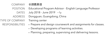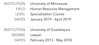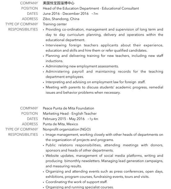 長頸鹿美語 教育計劃顧問-英語語言教授 2018年7月- 2019年6月~1年 美國悅寶園淄博中心 教育署署長-教育顧問 2016年6月- 2016年12月~7m 和平蓬米塔基金會 市場總監(jiān)-英語老師 2015年2月- 2016年5月~1y 4m 美國悅寶園濰坊中?心 英語教授 2014年1月- 2015年2月~ 1y2m 中國,北京 早期教育研究所 明尼蘇達大學(xué)場人力資源管理水平專業(yè)課程日期2019年1月瓜達拉哈拉大學(xué)學(xué)位的律師日期2013年2月- 2018年5月 |