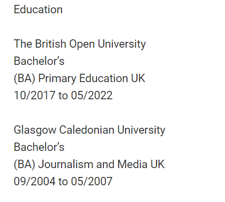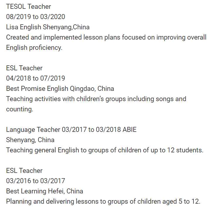 英國公開大學(xué) 學(xué)士學(xué)位 (BA)英國初等教育 10/2017至05/2022 拉斯哥喀里多尼亞大學(xué) 學(xué)士學(xué)位 (BA)英國新聞與媒體 09/2004至05/2007 工作經(jīng)歷: TESOL老師 08/2019至03/2020 沈陽,中國 創(chuàng)建并實(shí)施了旨在提高整體英語水平的課程計(jì)劃 ESL老師 04/2018至07/2019 最佳諾言英語中國青島 與兒童團(tuán)體一起進(jìn)行的教學(xué)活動(dòng),包括唱歌和計(jì)數(shù) 語言老師03/2017至03/2018 ABIE 中國沉陽 向不超過12名學(xué)生的兒童群體教授通用英語 ESL老師 03/2016至03/2017 最佳學(xué)習(xí)中國合肥 計(jì)劃并向5至12歲的兒童小組授課 |