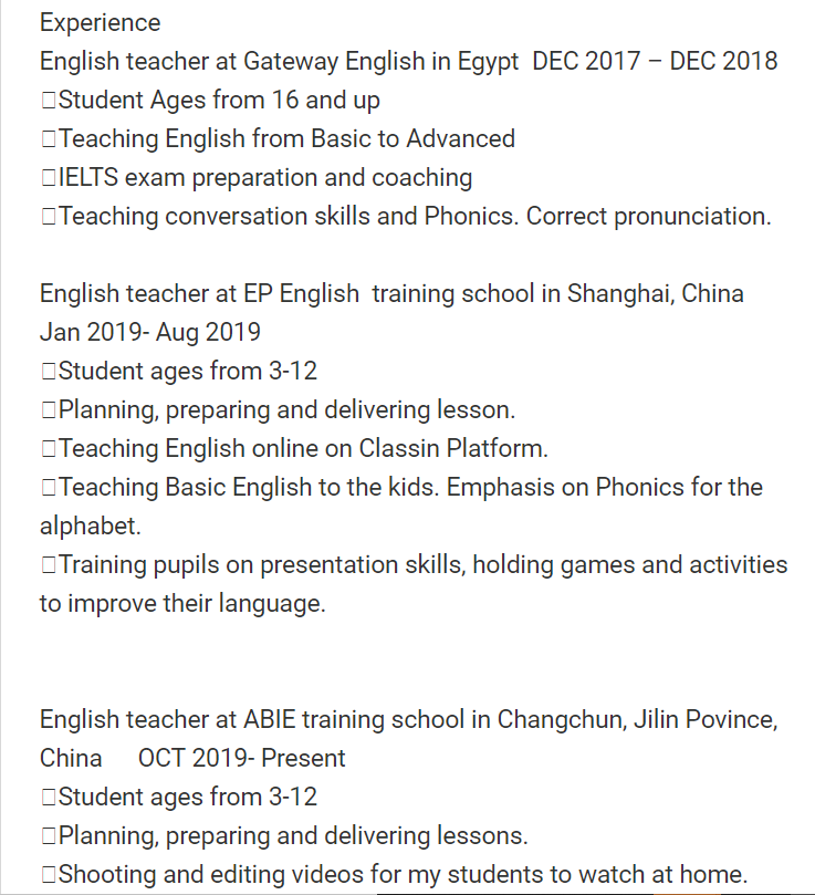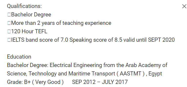 教育: 資格: ?學士學位 ?兩年以上的教學經(jīng)驗 ?120小時TEFL 教育 學士學位:科學技術(shù)與海運學院(AASTMT)的電機工程 經(jīng)驗: Gateway English擔任英語老師 在中國上海EP英語培訓(xùn)學校任英語老師 中國吉林省長春市ABIE培訓(xùn)學校英語老師, |
