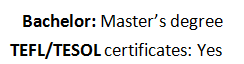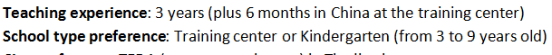 學(xué)士:碩士學(xué)位 TEFL / TESOL證書:是 簽證類型:M一年(02/2020 – 02/2021) 教學(xué)經(jīng)驗(yàn):3年(在中國(guó)培訓(xùn)中心加6個(gè)月) |