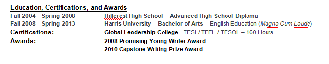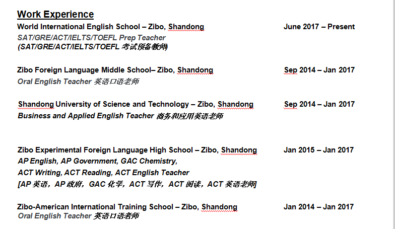 SAT / GRE / ACT /雅思/托福預(yù)備老師 (SAT / GRE / ACT /雅思/托??荚囶A(yù)備教師) 淄博外國語中學(xué)–山東淄博2014年9月– 2017年1月 英語口語老師 山東科技大學(xué)–山東淄博,2014年9月– 2017年1月 商務(wù)和應(yīng)用英語老師商務(wù)和應(yīng)用英語老師 淄博實(shí)驗(yàn)外國語高級中學(xué)–山東淄博2015年1月– 2017年1月 AP英語,AP政府,GAC化學(xué), ACT寫作,ACT閱讀,ACT英語老師 [AP英語,AP政府,GAC化學(xué),ACT寫作,ACT閱讀,ACT英語老師] 淄博美國國際培訓(xùn)學(xué)校–山東淄博,2014年1月– 2017年1月 英語口語老師 教育,認(rèn)證和獎勵 2004年秋季– 2008年春季Hillcrest高中–高級中學(xué)文憑 2008年秋季– 2013年春季哈里斯大學(xué)–文學(xué)學(xué)士–英語教育(麥格納·勞德) 認(rèn)證:全球領(lǐng)導(dǎo)力學(xué)院-TESL / TEFL / TESOL-160小時(shí) 獎項(xiàng):2008年有前途的青年作家獎 2010年Capstone寫作獎 |