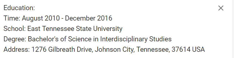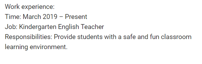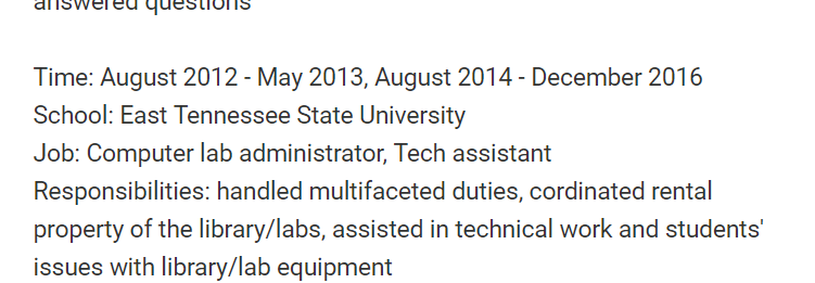 教育: 時(shí)間:2010年8月-2016年12月 學(xué)校:東田納西州立大學(xué) 學(xué)位:跨學(xué)科研究理學(xué)學(xué)士 地址:美國田納西州約翰遜市1276 Gilbreath Drive,美國 工作經(jīng)驗(yàn): 時(shí)間:2019年3月–至今 職位:幼兒園英語老師 職責(zé):為學(xué)生提供一個(gè)安全有趣的課堂學(xué)習(xí)環(huán)境 時(shí)間:2012年8月-2013年5月,2014年8月-2016年12月 學(xué)校:東田納西州立大學(xué) |