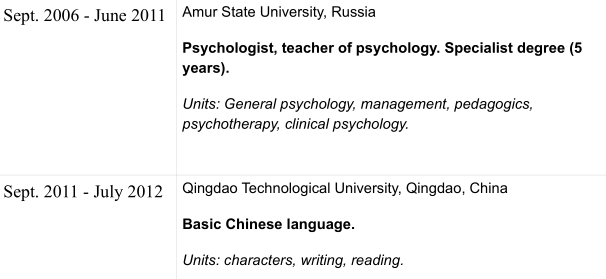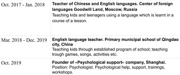 教育 2006年9月-2011年6月 俄羅斯阿穆爾州立大學(xué) 心理學(xué)家,心理學(xué)老師。 本科學(xué)歷(5 年份)。 工作經(jīng)歷 十月2017-一月2018 中文和英文老師。 Goodwill Land,莫斯科,俄羅斯 教孩子和青少年使用在一節(jié)課中學(xué)到的語言 2018年3月-2019年12月 英語老師。 青島市立小學(xué) 中國城市 通過學(xué)校的既定課程教孩子們; 教學(xué) 通過游戲,歌曲,活動等 2019年10月 上?!靶睦碇С帧惫緞?chuàng)始人。 職位:心理學(xué)家。 心理幫助,支持,培訓(xùn), 工作坊 |