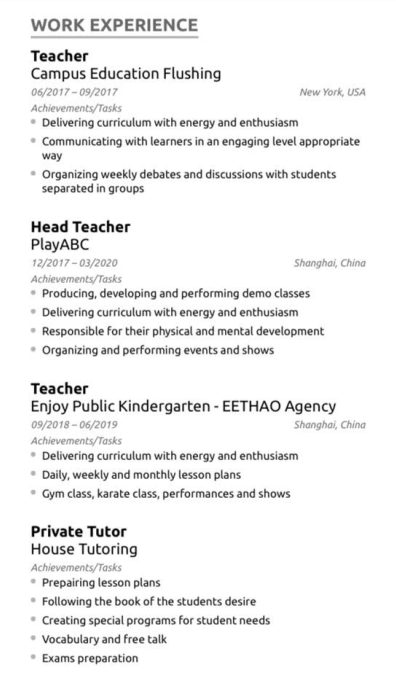英語專業(yè)本科,有tefl , 美國有教學(xué)經(jīng)驗, 在上海培訓(xùn)機構(gòu)和幼兒園都有教學(xué)經(jīng)驗,之前做過教學(xué)主任,符合規(guī)定的工作簽證 |