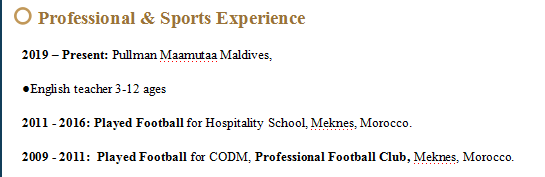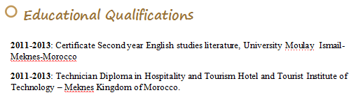 2011-2013年:獲得英語學習文學證書,穆萊大學伊斯梅爾大學-梅克內(nèi)斯-摩洛哥 2011-2013:摩洛哥梅克內(nèi)斯王國酒店及旅游飯店和旅游技術(shù)學院的技術(shù)員文憑。 2014年-2016年:酒店培訓師。 2011年-2013年:足球教練,。 2009年-2011年:為摩洛哥梅克內(nèi)斯職業(yè)足球俱樂部效力于CODM足球隊。 2019 年至今: 英語教師 |