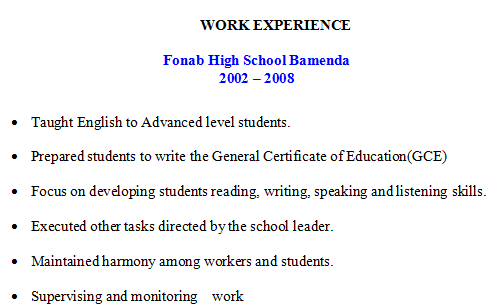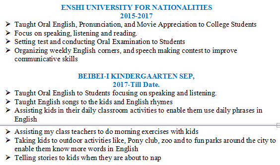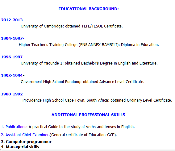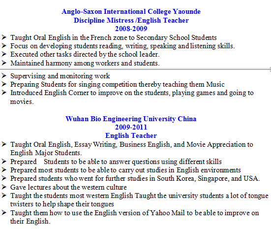 外教有非常豐富的教學(xué)經(jīng)驗(yàn) 高中 英語老師 大學(xué)(雅溫得盎格魯撒克遜國(guó)際學(xué)院)教書 中國(guó)武漢生物工程大學(xué)(英語老師) 北京大學(xué)附屬中學(xué)中國(guó)武漢2011-2012英語老師 2012 - 2013 劍橋大學(xué):獲得TEFL/TESOL證書。 1994 - 1997 高等教師培訓(xùn)學(xué)院(ENS附件BAMBILI):教育文憑。 1996 - 1997 雅溫得大學(xué)1:獲得英語和文學(xué)學(xué)士學(xué)位。 1993 - 1994 官辦高中Fundong:獲得高級(jí)水平證書。 1988 - 1992 南非開普敦普羅維登斯高中:獲得普通水平證書。 |