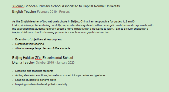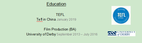 英國國籍,德比大學本科(電影制作專業(yè),具備TEFL證書,在中國北京擔任過英語老師,戲劇老師,擔任過銀行數字金融專家 |