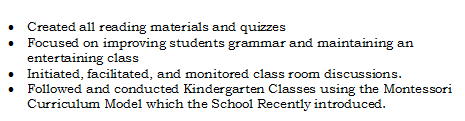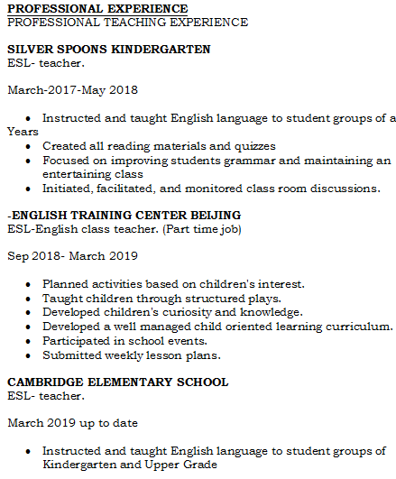 教育 學位-教育學學士學位 有計算機知識和學習技能,成績75% 教學經驗: 銀勺子幼兒園2017-2018 英語老師。 2017年3月———2018年5月 教 英語語言 3 到 5 歲 的 學生