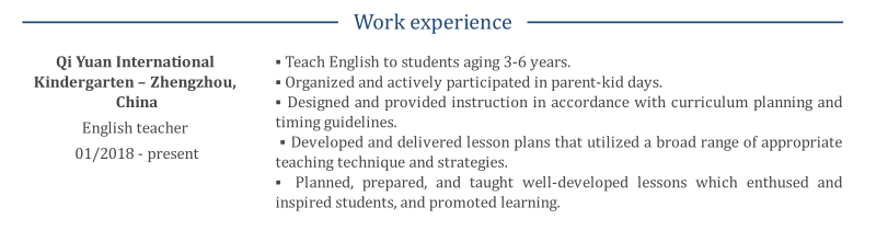 教學(xué)經(jīng)驗(yàn) 啟遠(yuǎn)國際 幼兒園–鄭州 中國 英語老師 ?向3-6歲的學(xué)生講英語。 ?組織并積極參加父母親日。 ?根據(jù)課程計(jì)劃設(shè)計(jì)和提供指導(dǎo) 時(shí)序準(zhǔn)則。 ?制定并交付了課程計(jì)劃,并利用了各種適當(dāng)?shù)姆椒?/p> 教學(xué)技巧和策略。 ?計(jì)劃,準(zhǔn)備和教授完善的課程,這些課程引起了 啟發(fā)學(xué)生,并促進(jìn)學(xué)習(xí)。 教育: 國立大學(xué) 建筑與建筑 信息技術(shù)自動(dòng)化碩士學(xué)位 有tefl |