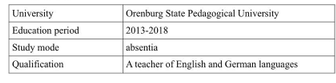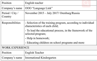 職位:英語老師 公司名稱:國際幼兒園 時(shí)間/城市/ 2017年8月-至今北京/中國 職位:英語老師 公司名稱:|000“l(fā)anguage link” 時(shí)間/城市/ 2015年11月- 2017年7月/奧倫堡/俄羅斯 大學(xué):奧倫堡州立師范大學(xué) 2013-2018. 英語和德語教師 |