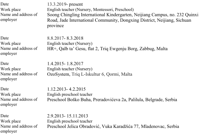 工作經歷 日期13.3.2019-現(xiàn)在 英語老師(幼兒園,蒙臺梭利,學前班) 雇主:宋慶齡國際幼兒園,內江校區(qū) 四川省內江市東興區(qū)玉國際社區(qū)路 日期8.8.2017- 8.3.2018 英語老師(幼兒園) 馬耳他 教育背景 日期2013年10月– 2015年2月 學前班教師碩士 機構名稱:貝爾格萊德大學教師培訓學院 |