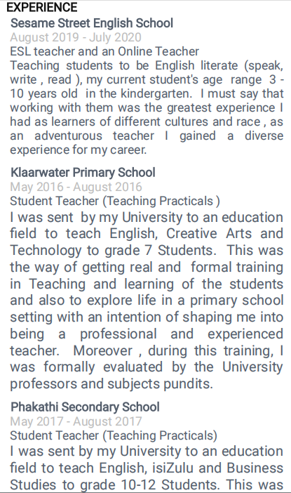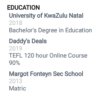 教育背景: 夸祖魯-納塔爾省大學(xué)2018教育學(xué)士學(xué)位 TEFL 120小時(shí)在線課程 2019 瑪格特·方丹塞克學(xué)校2013大學(xué)入學(xué)考試 教學(xué)經(jīng)驗(yàn): 2019/8-至今: 芝麻街 英語(yǔ)和在線老師 2016/-2016/6 小學(xué) 代課 2017/5-2017/8 初中代課 |
