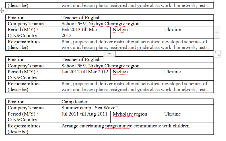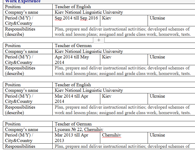 教育機(jī)構(gòu)名稱, (其他課程) (學(xué)位)登記月份和年份及畢業(yè)城市/國家 基輔國立語言大學(xué)碩士學(xué)位 (主要–英語)2013年9月2014年6月基輔/烏克蘭 工作經(jīng)驗(yàn) 英語職位老師 公司名稱基輔國立語言大學(xué) 德語職位老師 公司名稱基輔國立語言大學(xué) 德語職位老師 公司名稱Lyceum№22,切爾尼戈夫 英語職位老師 公司名稱School№9,切爾尼戈夫州 |