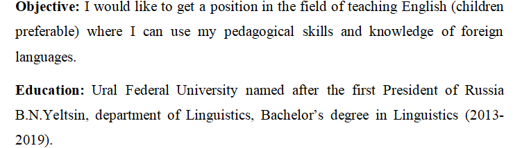 教育程度:烏拉爾聯(lián)邦大學,語言學系的語言學學士學位(2013-2019年)。 練習英語 2013-2014年個人英語補習兒童(8-12歲) 俄羅斯Kamensk-Uralskiy |