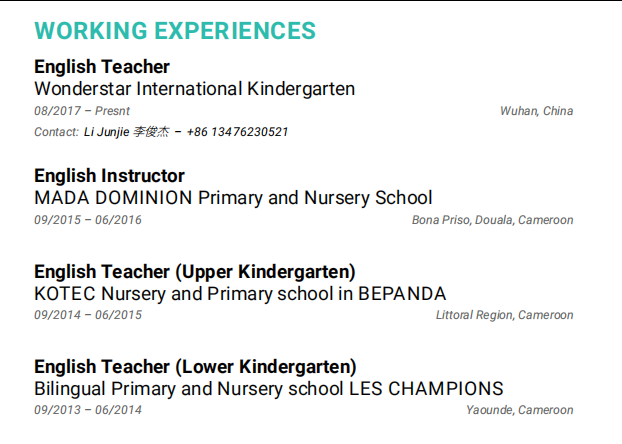 2010-2013:語言大學(xué),英語語言專業(yè)畢業(yè);2015年取得TEFL. 2017年8月–現(xiàn)在,英語教師。國際幼兒園聯(lián)系人:黎俊杰李俊杰–+86 13476230521 中國武漢