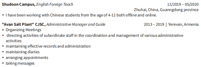 專業(yè)經(jīng)驗(yàn) Shudoon校園,英語對(duì)外教學(xué) 12/2019 – 05/2020珠海,中國廣東省 我一直在與4-12歲的中國學(xué)生進(jìn)行離線和在線合作。 教育背景 埃里溫·布魯索夫國立語言和社會(huì)科學(xué)大學(xué) 語言學(xué)和跨文化傳播學(xué)碩士學(xué)位 TESOL / 120小時(shí)ICOES 有老公一起求職 |