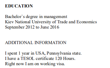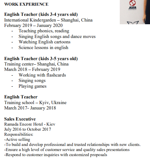 工作經(jīng)驗: 英語老師(3-4歲)國際幼兒園-中國上海2019年2月- 2020年1月 -教語音,閱讀 -唱英文歌曲和舞蹈動作 -看英文卡通片 -英語科學(xué)課 英語老師(3-5歲)培訓(xùn)中心-中國上海2018年3月至2019年2月 -使用抽認卡 ——唱歌 ——玩游戲 英語老師 培訓(xùn)學(xué)校-基輔,烏克蘭2017年3月- 2018年1月 教育: 管理學(xué)士學(xué)位 基輔國立經(jīng)貿(mào)大學(xué) 2012年9月至2016年6月 額外的信息 在美國賓夕法尼亞州呆了一年。 有TESOL證書120小時。 |