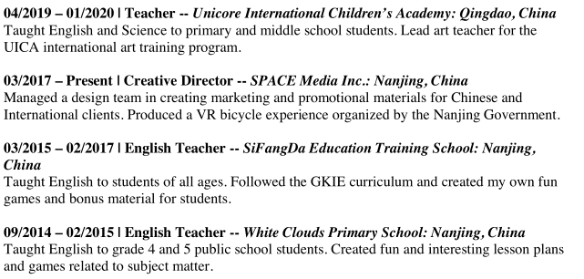 相關(guān)工作經(jīng)驗(yàn) 04/2019 – 01/2020 | 老師-Unicore國(guó)際兒童學(xué)院:中國(guó)青島 向中小學(xué)生教授英語(yǔ)和科學(xué)。 首席美術(shù)老師 UICA國(guó)際藝術(shù)培訓(xùn)計(jì)劃。 03/2015 – 02/2017 | 英語(yǔ)老師-思方達(dá)教育培訓(xùn)學(xué)校:南京,中國(guó) 向各個(gè)年齡段的學(xué)生教授英語(yǔ)。 09/2014 – 02/2015 | 英語(yǔ)老師-白云小學(xué):中國(guó)南京 為4年級(jí)和5年級(jí)的公立學(xué)校學(xué)生教授英語(yǔ)。 創(chuàng)建有趣課程計(jì)劃以及與主題相關(guān)的游戲 |