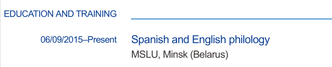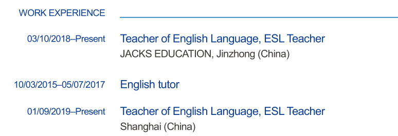 2018/03/10 – ESL現(xiàn)任英語老 晉中杰克斯教育(中國) 10/03 / 2015–05 / 07/2017英語導師 01/09 / 2019–ESL現(xiàn)任英語老師 上海,中國 教育和培訓 2015/06/09 –目前的西班牙語和英語語言學(白俄羅斯) |
