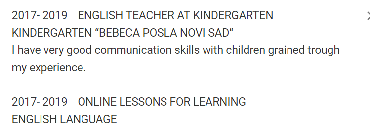工作經(jīng)歷: 2017- 2019幼兒園兒童英語老師 我與孩子的交流能力非常好,我的經(jīng)驗很豐富。 教育經(jīng)歷: 2011年– 2015年銀行與會計 商學院 |
