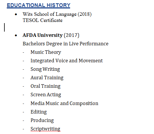 ?MPC招聘的在線英語老師(2019年1月至2019年4月) 威特沃特斯蘭德大學(Witswatersrand)威特語言學校外國學生ESL導師(2019年3月) MargotFonteyn中學中學的語音教練和編舞(助理老師 教育經(jīng)歷: 教育史 語言學院(2018)TESOL證書 美國食品藥品監(jiān)督管理局大學(2017) 現(xiàn)場表演學 |