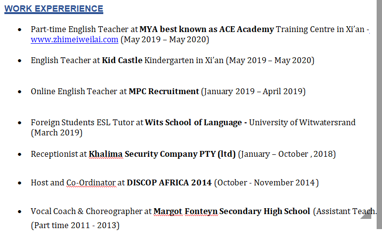 工作經(jīng)驗 最著名的兼職英語老師是西安ACE學院培訓中心-(2019年5月– 2020年5月) 西安兒童城堡幼兒園的英語老師(2019年5月– 2020年5月)