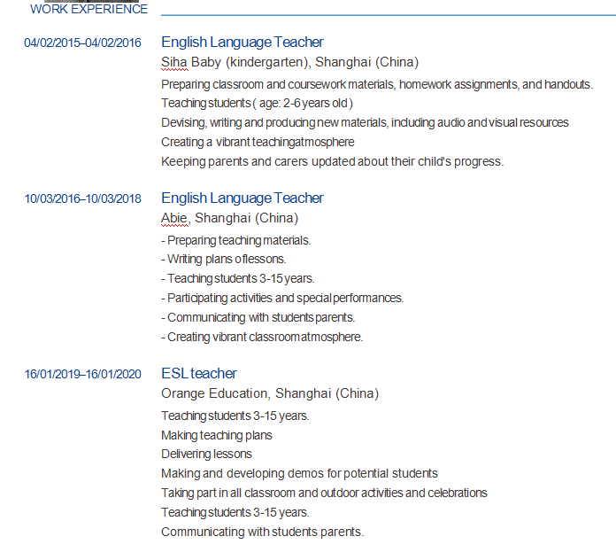 教育經(jīng)歷: 歐洲人道主義大學(xué),立陶宛維爾紐斯 新聞攝影 工作經(jīng)歷: 英語老師 Siha Baby(幼兒園),上海(中國) 準(zhǔn)備教室和課程作業(yè)材料,家庭作業(yè)和講義。 教學(xué)學(xué)生(年齡:2-6歲) 英語老師 上海阿比(中國) -準(zhǔn)備教材。 -課程的寫作計劃。 -教3-15歲的學(xué)生。 ESL老師 橙教育,上海(中國) 教學(xué)生3-15歲。 制定教學(xué)計劃上課 |