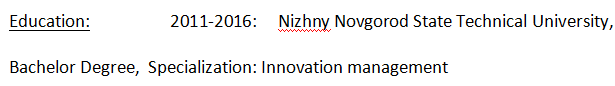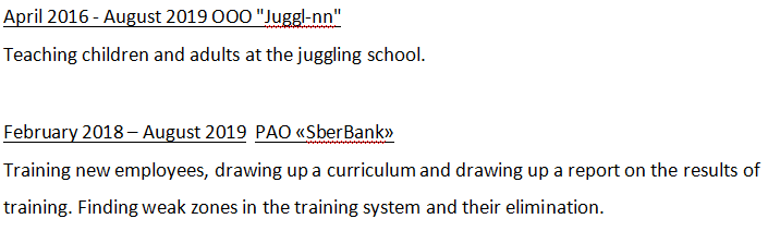 學(xué)歷:2011-2016:下諾夫哥羅德州立技術(shù)大學(xué),學(xué)士學(xué)位,專業(yè):創(chuàng)新管理 專業(yè)經(jīng)驗 2016年4月-2019年8月OOO“ Juggl-nn” 在雜耍學(xué)校教兒童和成人。 |