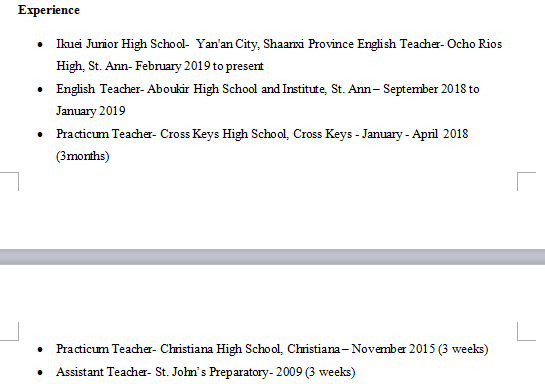教育背景: 本科 英語專業(yè) 2018 工作經(jīng)驗(yàn): 延安高中 2019/2-現(xiàn)在 阿布基爾高中 2018/9-2019/2 實(shí)習(xí)老師-高中- 2018年1月- 4月(3個(gè)月) 2015年高中實(shí)習(xí)老師,- 2015年11月(3周) 2009年助理老師-圣約翰(3周) |