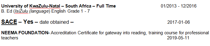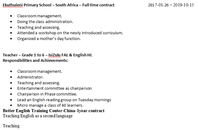 教育與資格 夸祖魯-納塔爾大學(xué)–南非–全日制01/2013-12/2016 B. Ed(IsiZulu(語(yǔ)言)英語(yǔ)1至7年級(jí) 工作經(jīng)驗(yàn) Ekuthuleni小學(xué)–南非–全日制合同2017-01-26 – 2019-10-15 老師– 1至6年級(jí)– IsiZulu FAL & English HL 百特英語(yǔ)培訓(xùn)中心-中國(guó)一年合同 |