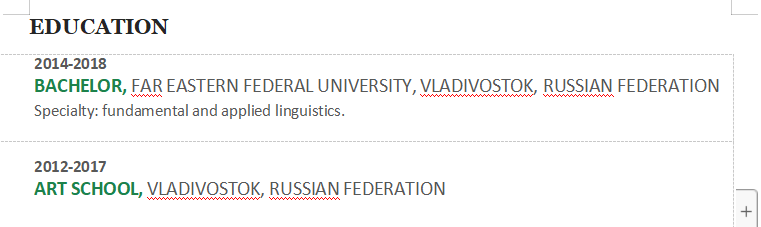 培訓(xùn)中心外教 工作地點(diǎn):中國(guó)廣東省深圳市 訓(xùn)中心外教 工作地點(diǎn):中國(guó),廣東省,惠州市 志愿服務(wù)中心 工作地點(diǎn):符拉迪沃斯托克(俄羅斯) 職責(zé):為年幼的學(xué)生提供英語(yǔ)課,教授中小學(xué)生英語(yǔ) 教育經(jīng)歷: 2014-2018 遠(yuǎn)東聯(lián)邦大學(xué)學(xué)士,符拉迪沃斯托克(俄羅斯) 專業(yè):基礎(chǔ)和應(yīng)用語(yǔ)言學(xué)。 |
