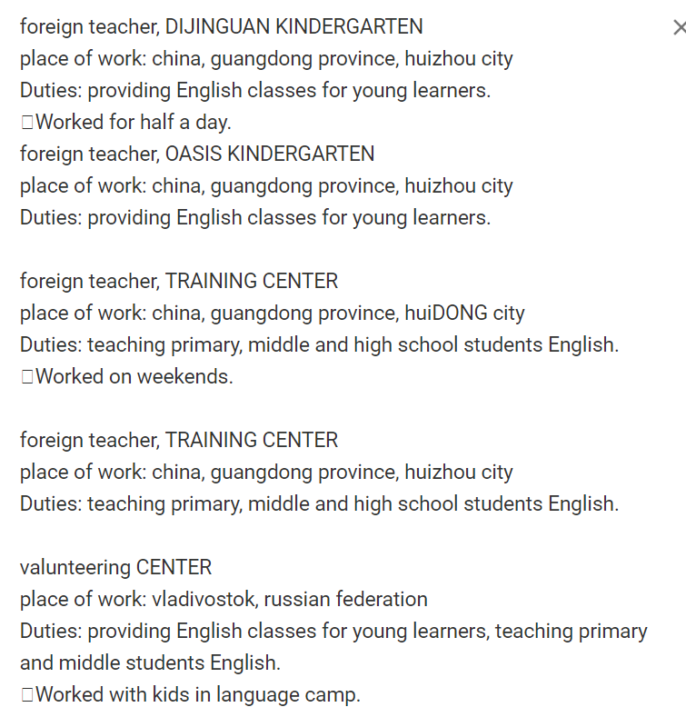 工作經(jīng)歷: 迪金關(guān)幼兒園外籍老師 工作地點(diǎn):中國(guó),廣東省,惠州市 職責(zé):為年輕學(xué)習(xí)者提供英語(yǔ)課程。