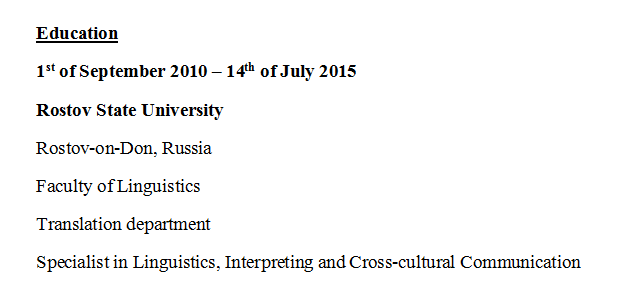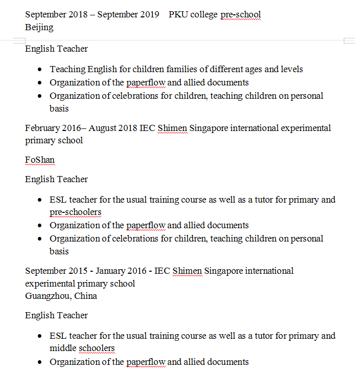 2018年9月– 2019年9月北京大學(xué)北京學(xué)前班 英語老師 ?為不同年齡和水平的兒童家庭提供英語教學(xué) ?組織流程和相關(guān)文件 ?組織兒童慶?;顒?dòng),親自教孩子 2016年2月– 2018年8月IEC石門新加坡國際實(shí)驗(yàn)小學(xué) 佛山 英語老師 ?ESL老師負(fù)責(zé)常規(guī)培訓(xùn)課程以及小學(xué)生和學(xué)齡前兒童的導(dǎo)師 ?組織流程和相關(guān)文件 ?組織兒童慶?;顒?dòng),親自教孩子 2015年9月-2016年1月-IEC石門新加坡國際實(shí)驗(yàn)小學(xué),中國廣州 英語老師 ?ESL老師負(fù)責(zé)常規(guī)培訓(xùn)課程以及中小學(xué)生的輔導(dǎo)老師 ?組織流程和相關(guān)文件 教育 2010年9月1日至2015年7月14日 羅斯托夫州立大學(xué) 俄羅斯頓河畔羅斯托夫 語言學(xué)系 翻譯部 語言學(xué),口譯和跨文化交流專業(yè) |