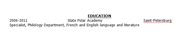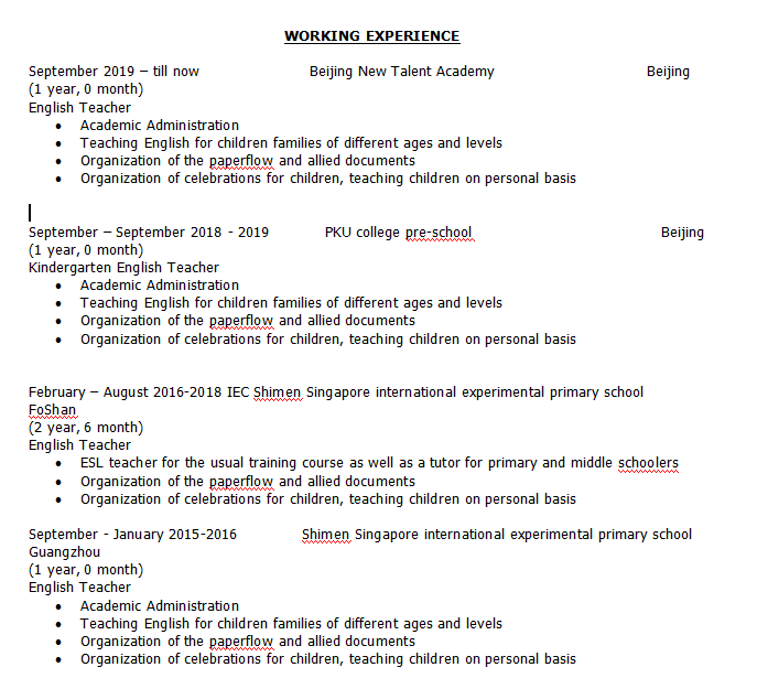 教育經(jīng)歷 2006-2011圣彼得堡國家極地學(xué)院 語言學(xué)系專家,法語和英語語言文學(xué) 工作經(jīng)驗(yàn) 2019年9月–至今北京新人才學(xué)院北京 (1年0個(gè)月) 英語老師 ·行政管理 ·不同年齡,不同水平的兒童家庭英語教學(xué) ·文件流程和相關(guān)文件的組織 ·組織兒童慶祝活動(dòng),個(gè)人教孩子 2018年9月– 2018年9月-北京大學(xué)北京學(xué)前班 (1年0個(gè)月) 幼兒園英語老師 ·行政管理 ·不同年齡,不同水平的兒童家庭英語教學(xué) ·文件流程和相關(guān)文件的組織 2016年2月至8月-2018年IEC石門新加坡國際實(shí)驗(yàn)小學(xué) 佛山 (2年6個(gè)月) 英語老師 ·ESL常規(guī)培訓(xùn)課程老師以及中小學(xué)生導(dǎo)師 ·文件流程和相關(guān)文件的組織 ·組織兒童慶?;顒?dòng),教孩子 2015年9月-1月-2016年石門新加坡國際實(shí)驗(yàn)小學(xué)廣州 (1年0個(gè)月) 英語老師 ·行政管理 ·不同年齡,不同水平的兒童家庭英語教學(xué) ·文件流程和相關(guān)文件的組織 ·組織兒童慶祝活動(dòng),教孩子 |