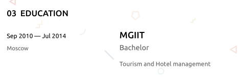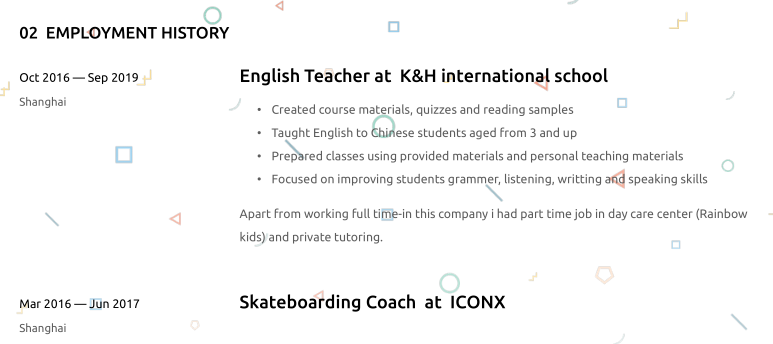 教學(xué)經(jīng)驗: 2016年10月— 2019年9月 上海 K&H國際學(xué)校英語老師 ?創(chuàng)建課程資料,測驗和閱讀樣本 ?為3歲以上的中國學(xué)生講英語 ?使用提供的材料和個人教學(xué)材料準備課程 ?專注于提高學(xué)生的語法,聽,說和寫能力 除了全職工作之外,我還在日托中心(彩虹)兼職 孩子們)和私人補習(xí)。 2016年3月— 2017年6月 上?;褰叹?/p> 教育經(jīng)驗 2010年9月— 2014年7月 本科 旅游和酒店管理 |
