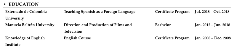大學(xué)指導(dǎo)與電影電視制作學(xué)士2012年1月 -2018年6月 英語教育學(xué)院英語課程證書課程2008年1月 -2008年12月 短片,商業(yè)廣告,獨(dú)立紀(jì)錄片,還有電視聲音人和二月的制作。 2015年至今,作為制作人,負(fù)責(zé)音效設(shè)計(jì)、視頻編輯和腳本撰寫: 負(fù)責(zé)銷售項(xiàng)目和籌款,開發(fā)了團(tuán)隊(duì)合作和組織技能 / 學(xué)科 / 邊緣外包解決方案(cos)呼叫中心業(yè)務(wù)顧問2017年5月至2017年8月。 國際之家(西安)漢語教師2019年8月-現(xiàn)在教英語的中國孩子從3至6歲在幼兒園帶領(lǐng)學(xué)生不同的學(xué)習(xí)活動(dòng)和表現(xiàn),通過整個(gè)學(xué)期。 |