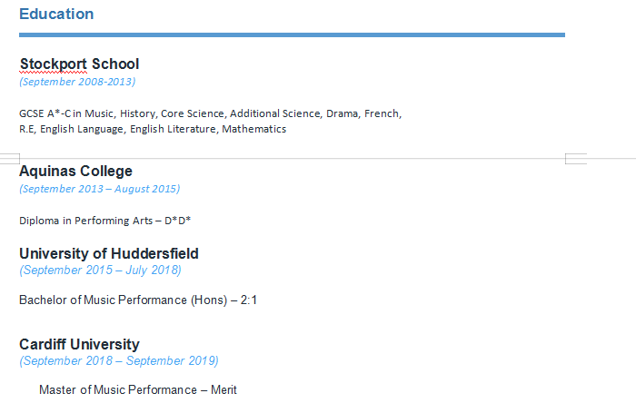 成就和職責: ?幫助學生實現(xiàn)他們的績效目標 簡化復雜的和聲,使學生可以快速理解 ?為學生設定每周的練習目標 ?每周制定創(chuàng)意的教案,以吸引學生 ?批判性和創(chuàng)造性思維 ?通過學習成果和評分標準對學生進行評估 ?整個教學團隊的受支持成員 ?幫助學生認識到協(xié)作的重要性 ?在學生的音樂之旅中為其提供支持,以確保獲得最佳成績 哈德斯菲爾德大學 (2015年9月– 2018年7月) 碩士 |