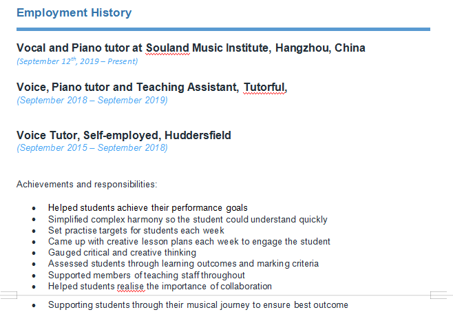 杭州蘇蘭音樂學院聲樂與鋼琴老師 (2019年9月12日–至今) 語音,鋼琴家教兼助教,輔導, (2018年9月– 2019年9月) 語音導師,自雇,哈德斯菲爾德 (2015年9月– 2018年9月)