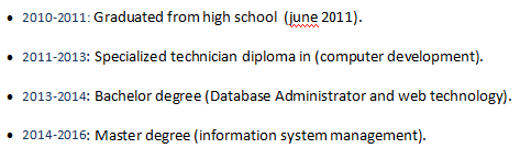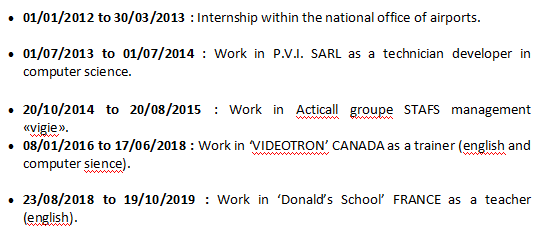 2016年8月1日至2018年6月17日:在加拿大的“ VIDEOTRON”擔任培訓師(英語和計算機科學)。 ?23/ 08/2018至19/10/2019:在法國“唐納德學?!币岳蠋煹纳矸莨ぷ鳎ㄓ⒄Z)。 ?2014-2016年:碩士學位(信息系統(tǒng)管理)。 |