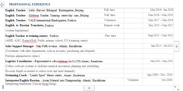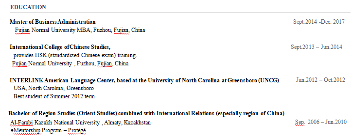教育經(jīng)歷: 教育 工商管理碩士2014年9月-12月 2017年 福建師范大學(xué)MBA,福建福州 國(guó)際中文學(xué)院,2013年9月– 2014年6月 美國(guó)語(yǔ)言中心,位于北卡羅來(lái)納大學(xué)格林斯伯勒分校(UNCG),美國(guó)北卡羅來(lái)納州格林斯伯勒 區(qū)域研究學(xué)士學(xué)位(東方研究)與國(guó)際關(guān)系學(xué)(特別是中國(guó)區(qū)域) 哈薩克斯坦哈薩克國(guó)立大學(xué) 工作經(jīng)驗(yàn): 英語(yǔ)老師-小豐收雙語(yǔ)幼兒園,北京全日制Mar.2019– Jan.2020 2017年3月– 2018年3月,英語(yǔ)教師-YALE國(guó)際幼兒園 福州培訓(xùn)中心英語(yǔ)老師,兼職2013年9月– 2015年3月 010年11月 口譯/英語(yǔ)-俄語(yǔ),-亞洲物質(zhì)藝術(shù)錦標(biāo)賽,哈薩克斯坦, |