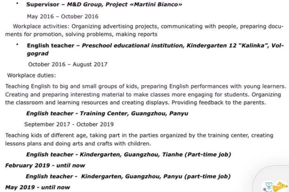 國籍: 俄羅斯 求職意向: 教師