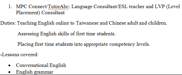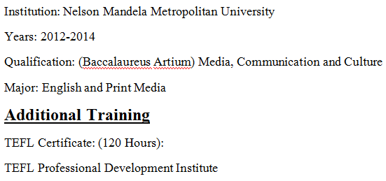 教育: 院校:納爾遜·曼德拉城市大學(xué) 年份:2012-2014 資格:(Baccalaureus Artium)媒體,傳播和文化 專業(yè):英語(yǔ)和印刷媒體 TEFL證書:(120小時(shí)): 工作經(jīng)歷 1.MPC Connect / TutorAbc:語(yǔ)言顧問/ ESL老師和LVP顧問 職責(zé):在線為臺(tái)灣和中國(guó)大陸成人和兒童教授英語(yǔ)。 評(píng)估初學(xué)者的英語(yǔ)技能。 |