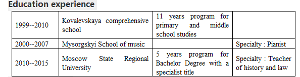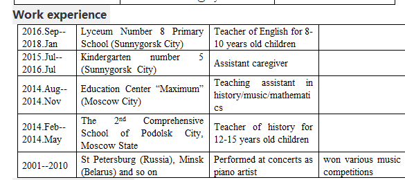 2016年9月-2018年1月,公墓8號(hào)小學(xué)(桑尼戈?duì)査箍耸校?-10歲兒童的英語老師 2015年7月--2016年7月5號(hào)幼兒園(桑尼戈?duì)査箍耸校┲肀D?/p> 2014.Aug--2014.Nov教育中心“最大”(莫斯科市)歷史/音樂/數(shù)學(xué)助教 2014年2月--2014年5月,莫斯科波多利斯克市第二綜合學(xué)校,歷史學(xué)老師,為12-15歲的孩子們 2001--2010圣彼得堡(俄羅斯),明斯克(白俄羅斯)等在音樂會(huì)上演出,鋼琴藝術(shù)家贏得了各種音樂比賽 教育經(jīng)歷 1999--2010年綜合學(xué)校中小學(xué),學(xué)習(xí)11年 2000--2007 Mysorgskyi音樂學(xué)院專業(yè):鋼琴 2010--2015年莫斯科國立地方大學(xué)5年制本科學(xué)位課程,專業(yè)名稱為歷史與法學(xué)老師 |