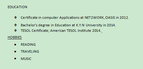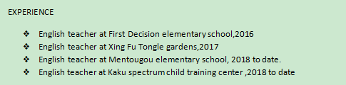 2012年,?Certificate在oasis net2 work的計算機應(yīng)用。 2014年獲得?Bachelor's教育學(xué)位。 技術(shù)教育證書;美國技術(shù)教育學(xué)院2014。 2016年,第一決策小學(xué)的?English老師 2017年,幸福樂瞳花園的?English老師 門頭溝小學(xué)?English老師,2018年至今。 2018年至今,Kaku spectrum兒童培訓(xùn)中心的英語教師 |