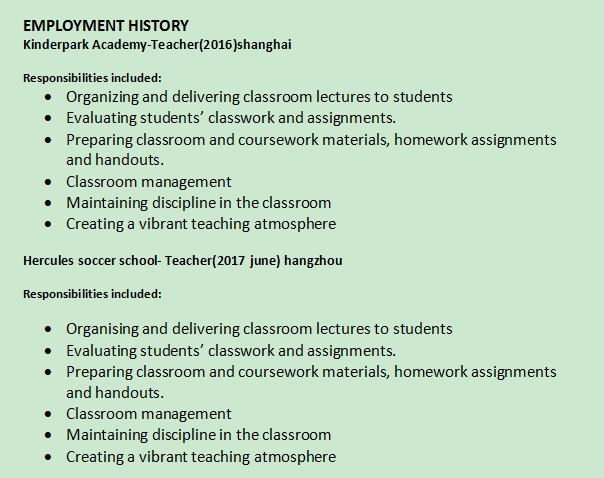 開(kāi)普敦大學(xué)體育學(xué)士學(xué)位(2015年12月畢業(yè)) 急救證書(shū)。 歐足聯(lián)教練執(zhí)照。(足球) 幼兒園教師(2016)上海 職責(zé)包括: 組織并向?qū)W生提供課堂講座,評(píng)估學(xué)生的課堂作業(yè)和作業(yè)。準(zhǔn)備課堂和課程材料、家庭作業(yè)和講義。 教室管理:保持課堂紀(jì)律,創(chuàng)造充滿活力的教學(xué)氛圍。