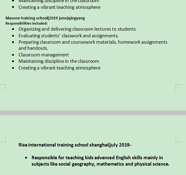 職責(zé)包括: 組織并向?qū)W生提供課堂講座,評(píng)估學(xué)生的課堂作業(yè)和作業(yè)。準(zhǔn)備課堂和課程材料、家庭作業(yè)和講義。 教室管理:保持課堂紀(jì)律,創(chuàng)造充滿活力的教學(xué)氛圍。 共濟(jì)會(huì)培訓(xùn)學(xué)校(2019年6月)慶陽(yáng), 職責(zé)包括: 組織并向?qū)W生提供課堂講座,評(píng)估學(xué)生的課堂作業(yè)和作業(yè)。準(zhǔn)備課堂和課程材料、家庭作業(yè)和講義。 教室管理:保持課堂紀(jì)律,創(chuàng)造充滿活力的教學(xué)氛圍。 上海瑞思國(guó)際培訓(xùn)學(xué)校(2019年7月-回國(guó)前) 負(fù)責(zé)教授孩子高級(jí)英語(yǔ)技能,主要是社會(huì)地理、數(shù)學(xué)和自然科學(xué)等科目。 |
